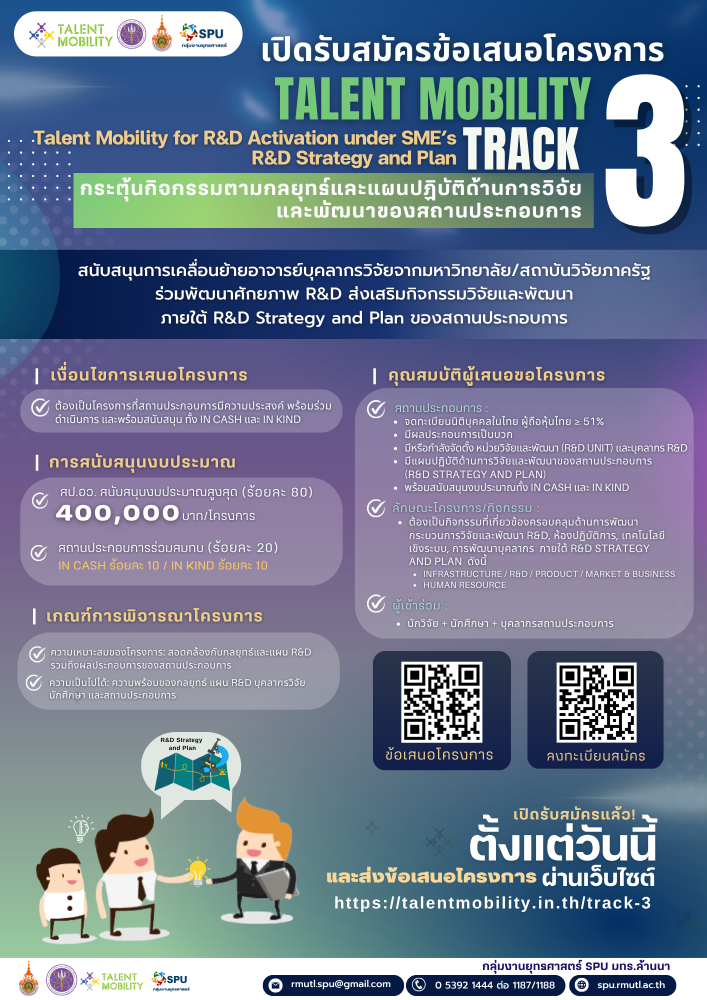 สป.อว. เปิดรับสมัครข้อเสนอโครงการ Talent Mobility TRACK 3 : Talent Mobility for R&D Activation under SME’s R&D Strategy and Plan กระตุ้นกิจกรรมตามกลยุทธ์และแผนปฏิบัติด้านการวิจัยและพัฒนาของสถานประกอบการ