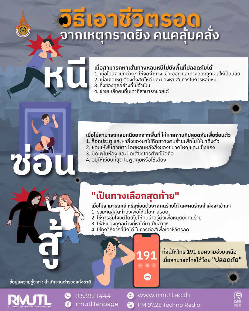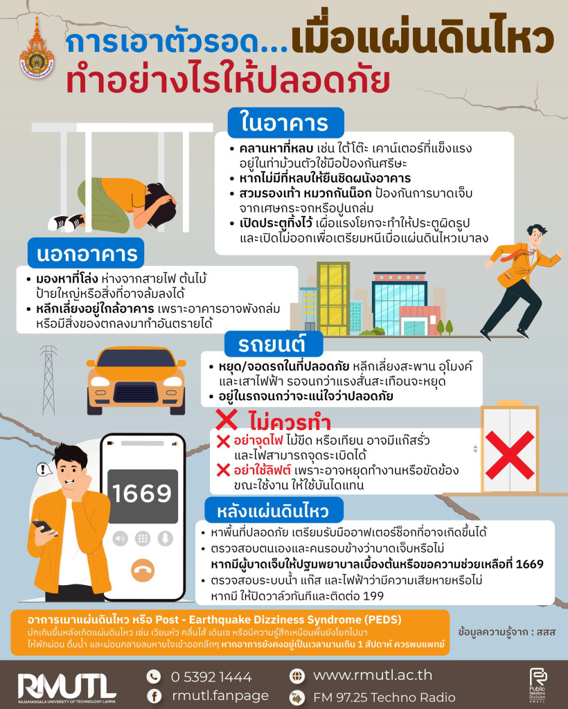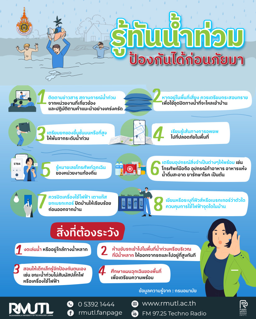 มหาวิทยาลัยเทคโนโลยีราชมงคลล้านนา ขอเชิญชวนคณาจารย์ บุคลากร นักศึกษา และประชาชนทุกท่าน ร่วมตระหนักถึงความสำคัญของการเตรียมความพร้อมในการรับมือกับ ภัยพิบัติทุกรูปแบบ ไม่ว่าจะเป็นอุทกภัย วาตภัย แผ่นดินไหว ไฟป่า หรือเหตุฉุกเฉินอื่น ๆ ที่อาจเกิดขึ้นได้โดยไม่คาดคิด การมีความรู้ ความเข้าใจ และการวางแผนรับมืออย่างถูกต้อง คือกุญแจสำคัญในการลดความสูญเสียและปกป้องชีวิตของเราและคนรอบข้าง