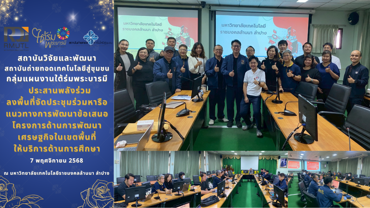 วันที่ 7 พฤศจิกายน พ.ศ.2568 ณ ห้องประชุม 1 อาคารอำนวยการ มหาวิทยาลัยเทคโนโลยีราชมงคลล้านนา ลำปาง นำโดย ผู้ช่วยศาสตราจารย์ธีระศักดิ์ สมศักดิ์ ผู้อำนวยการสถาบันวิจัยและพัฒนา ผู้ช่วยศาสตราจารย์วรจักร์ เมืองใจ หัวหน้ากลุ่มแผนงานใต้ร่มพระบารมี และคณาจารย์ นักวิจัย บุคลากร สถาบันวิจัยและพัฒนา สถาบันถ่ายทอดเทคโนโลยีสู่ชุมชนร่วมกับกลุ่มแผนงานใต้ร่มพระบารมี จัดประชุมร่วมหารือแนวทางการพัฒนาข้อเสนอโครงการด้านการพัฒนาเศรษฐกิจในเขตพื้นที่ให้บริการด้านการศึกษา เพื่อชี้แจงแนวทางการขับเคลื่อนและพัฒนามหาวิทยาลัยเทคโนโลยีราชมงคลล้านนา ด้านงานวิจัย สถาบันวิจัยและพัฒนา และด้านบริการวิชาการ สถาบันถ่ายทอดเทคโนโลยีสู่ชุมชนร่วมกับกลุ่มแผนงานใต้ร่มพระบารมี และพัฒนาโจทย์วิจัย การบริการวิชาการ ที่ตอบสนองต่อความต้องการสถานการณ์ในพื้นที่ร่วมกับผู้บริหาร คณาจารย์ นักวิจัย และบุคลากร มทร.ล้านนา ลำปาง โดยได้รับเกียรติจาก ผู้ช่วยศาสตราจารย์กนกวรรณ เวชกามา รักษาราชการแทนผู้อำนวยการกองบริหารทรัพยากรลำปาง ผู้อำนวยการสำนักงานบริหาร มทร.ล้านนา ลำปาง ให้เกียรติเป็นประธาน และกล่าวเปิดกิจกรรม