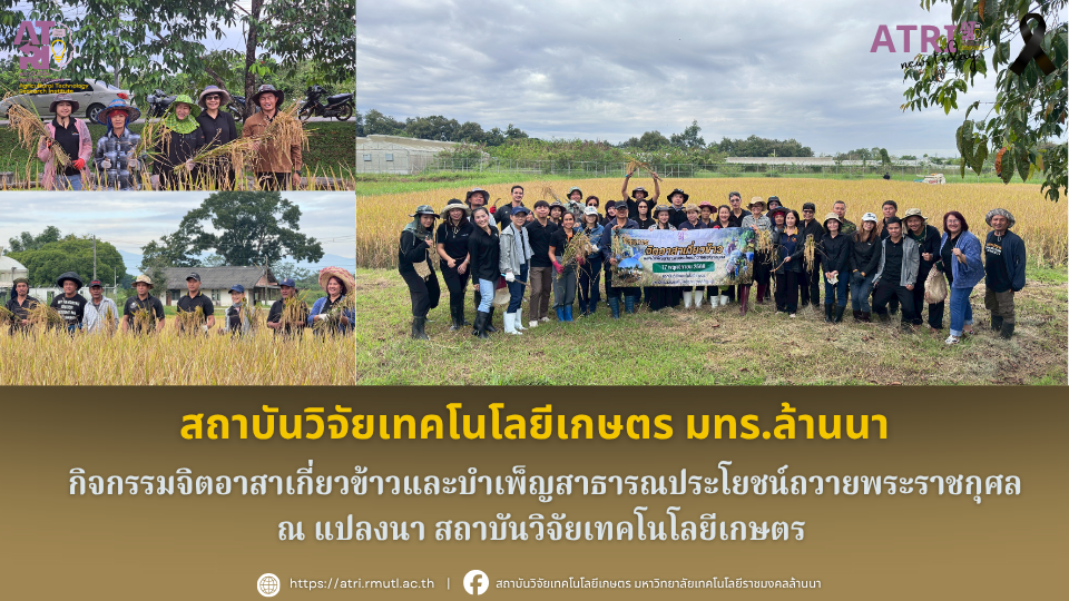 สถาบันวิจัยเทคโนโลยีเกษตร มทร.ล้านนา นำโดยนายชิติ ศรีตนทิพย์ รองผู้อำนวยการฯฝ่ายวิจัยและบริการวิชาการ เป็นประธานเปิดงานและร่วมถวายพระพรโครงการ “กิจกรรมจิตอาสาเกี่ยวข้าวและบำเพ็ญสาธารณประโยชน์ถวายพระราชกุศล” เนื่องในวาระสำคัญเดือนพฤศจิกายน ๒๕๖๘ อันเป็นเดือนมหามงคลที่ระลึกวันคล้ายวันสวรรคตครบ 100 ปี พระบาทสมเด็จพระมงกุฎเกล้าเจ้าอยู่หัว (25 พฤศจิกายน 2568) และวันคล้ายวันประสูติครบ 100 ปี สมเด็จพระเจ้าภคินีเธอ เจ้าฟ้าเพชรรัตนราชสุดา สิริโสภาพัณณวดี (24 พฤศจิกายน2568) เพื่อเป็นการน้อมรำลึกในพระมหากรุณาธิคุณและถวายพระราชกุศลแด่ทั้งสองพระองค์