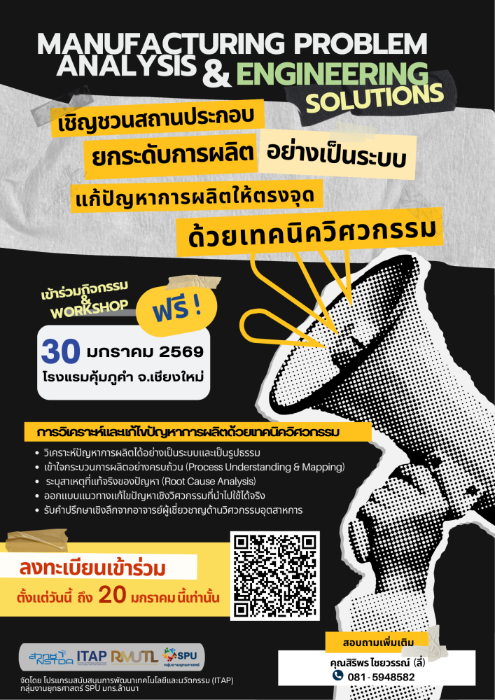 เพิ่มประสิทธิภาพ ลดต้นทุน แก้ปัญหาการผลิตได้ตรงจุด ขอเชิญผู้บริหาร ผู้จัดการโรงงาน สถานประกอบการ และบุคลากรภาคอุตสาหกรรม เข้าร่วมกิจกรรมอบรมเชิงปฏิบัติการ
