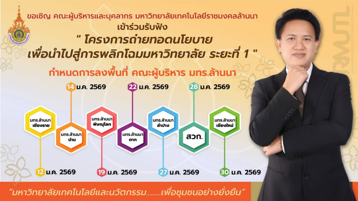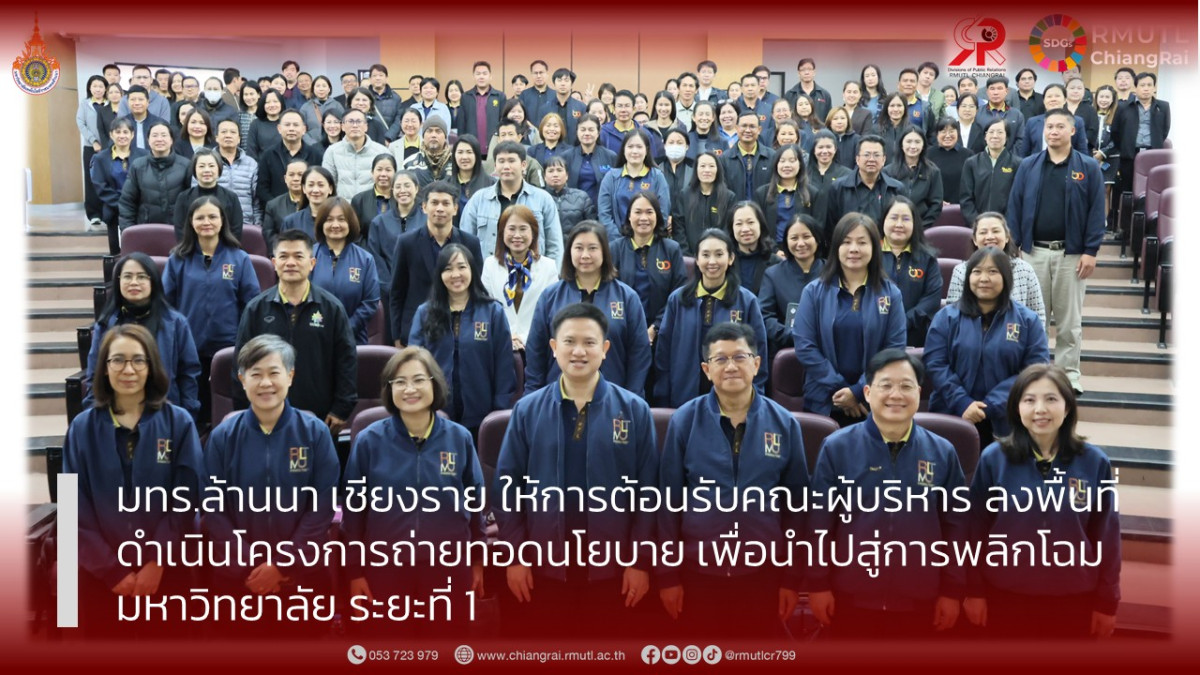ระหว่างวันที่ 12 – 13 มกราคม 2569 คณะผู้บริหาร คณาจารย์ และบุคลากร มหาวิทยาลัยเทคโนโลยีราชมงคลล้านนา เชียงราย ให้การต้อนรับคณะผู้บริหารจากมหาวิทยาลัยเทคโนโลยีราชมงคลล้านนา นำโดย ผู้ช่วยศาสตราจารย์อรรณพ ทัศนอุดม รักษาราชการแทนอธิการบดี พร้อมด้วยรองอธิการบดี ผู้ช่วยอธิการบดี ผู้อำนวยการกอง พร้อมคณะ ในโอกาสลงพื้นที่ดำเนินโครงการถ่ายทอดนโยบายเพื่อนำไปสู่การพลิกโฉมมหาวิทยาลัย ระยะที่ 1
