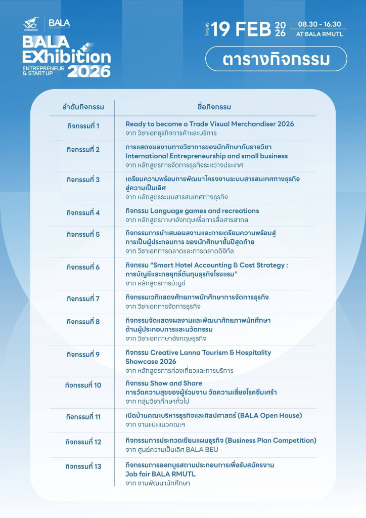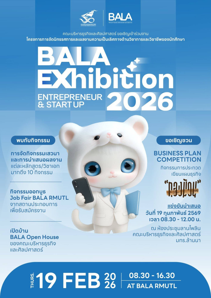 คณะบริหารธุรกิจและศิลปศาสตร์ มหาวิทยาลัยเทคโนโลยีราชมงคลล้านนา เชียงใหม่ ขอเชิญชวนนักเรียน นักศึกษา ผู้ประกอบการ และผู้สนใจทั่วไป เข้าร่วมงาน BALA Exhibition 2026 : Entrepreneur & Start Up ซึ่งกำหนดจัดขึ้นในวันพฤหัสบดีที่ 19 กุมภาพันธ์ 2569 ณ คณะบริหารธุรกิจและศิลปศาสตร์ มทร.ล้านนา เชียงใหม่