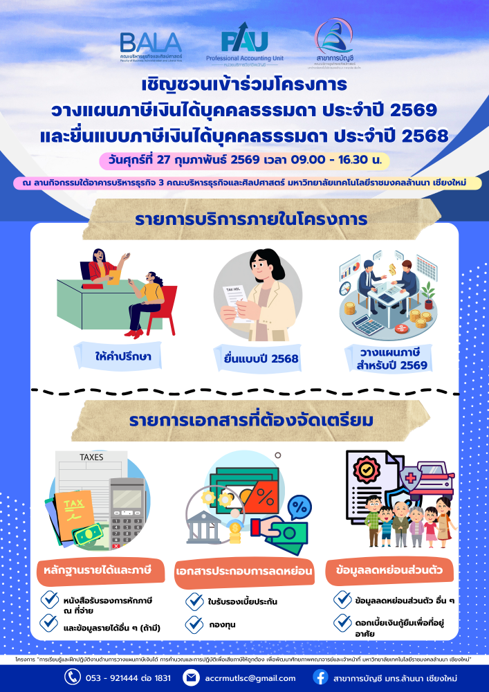 คณะบริหารธุรกิจและศิลปศาสตร์ สาขาการบัญชี มหาวิทยาลัยเทคโนโลยีราชมงคลล้านนา (เชียงใหม่) ขอเชิญชวนคณาจารย์และบุคลากรในสังกัดมหาวิทยาลัยฯ เข้าร่วมโครงการ “การเรียนรู้และฝึกปฏิบัติงานด้านการวางแผนภาษีเงินได้ การคำนวณและการปฏิบัติเพื่อเสียภาษีให้ถูกต้อง เพื่อพัฒนาศักยภาพคณาจารย์และเจ้าหน้าที่”
