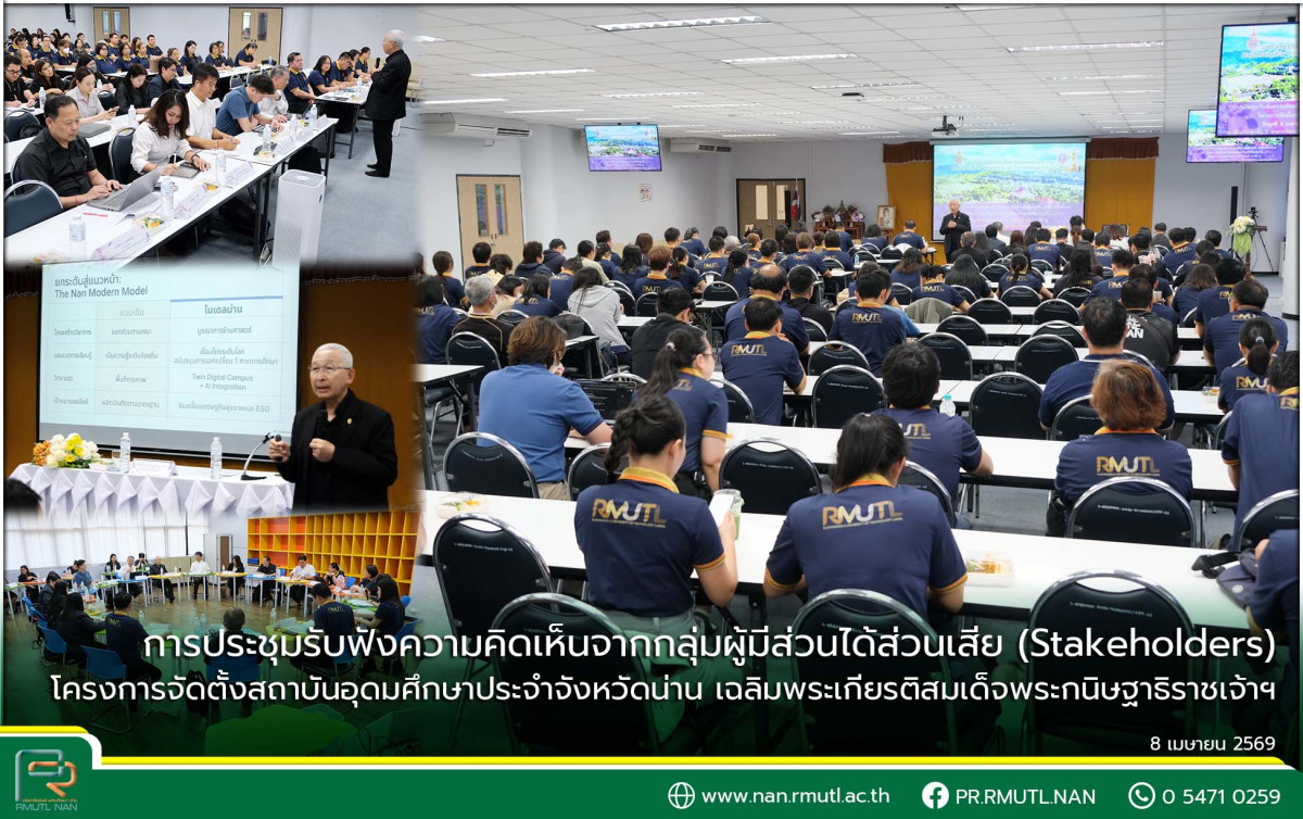 วันพุธที่ 8 เมษายน 2569 ศาสตราจารย์คลีนิคเกียรติคุณ อุดม คชินทร ในฐานะประธานกรรมการพิจารณาการจัดตั้งและการแบ่งส่วนราชการของสถาบันอุดมศึกษาจังหวัดน่าน และคณะกรรมการ ได้ลงพื้นที่ มทร.ล้านนา น่าน ในการประชุมรับฟังความคิดเห็นจากกลุ่มผู้มีส่วนได้ส่วนเสีย (Stakeholders) โครงการจัดตั้งสถาบันอุดมศึกษาประจำจังหวัดน่าน เพื่อการศึกษาความพร้อมและเตรียมการยกฐานะ มหาวิทยาลัยเทคโนโลยีราชมงคลล้านนา (มทร.ล้านนา) น่าน ขึ้นเป็นสถาบันอุดมศึกษาประจำจังหวัดน่าน โดยมี ผศ.ดร.วิโรจน์ มงคลเทพ (ผู้อำนวยการสำนักงานบริหารมหาวิทยาลัย) พร้อมคณะผู้บริหาร คณาจารย์ บุคลากร และนักศึกษา เข้าร่วมประชุม ณ ห้องประชุมชั้น 3 อาคารวิทยบริการ มทร.ล้านนา น่าน จังหวัดน่าน