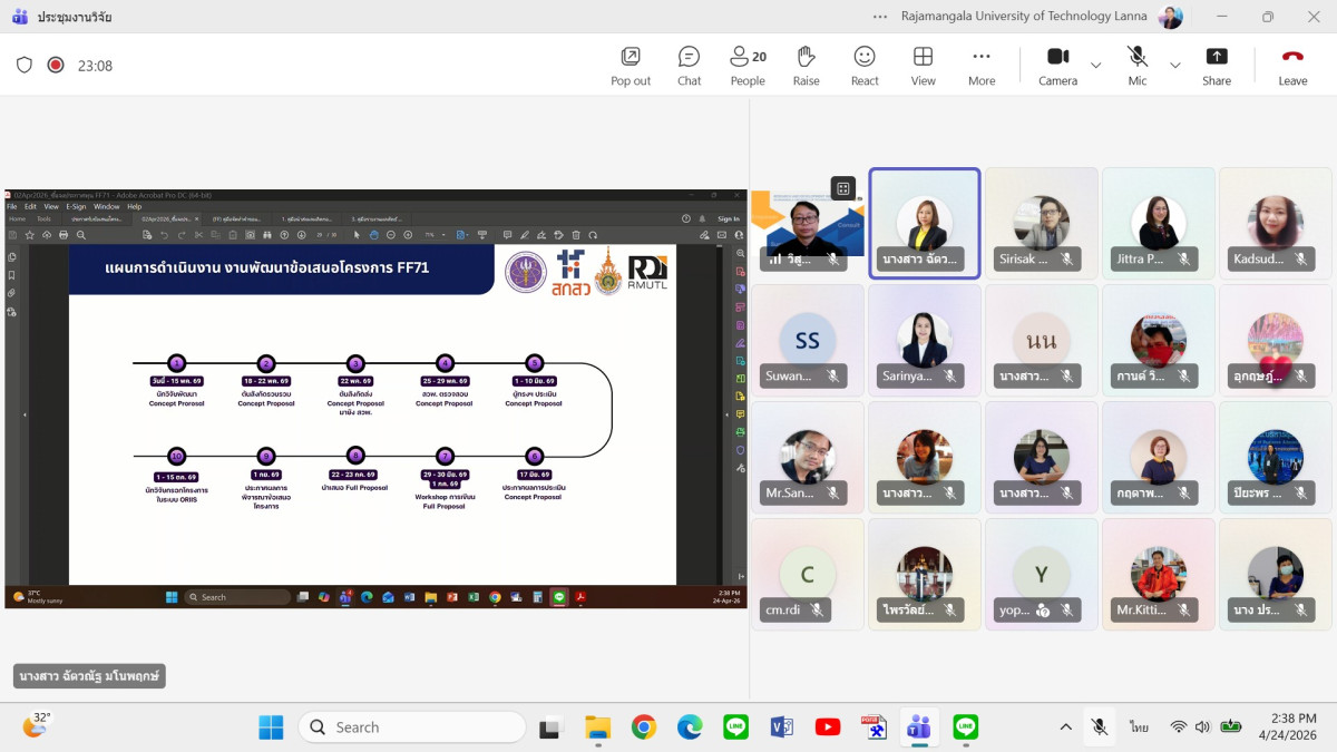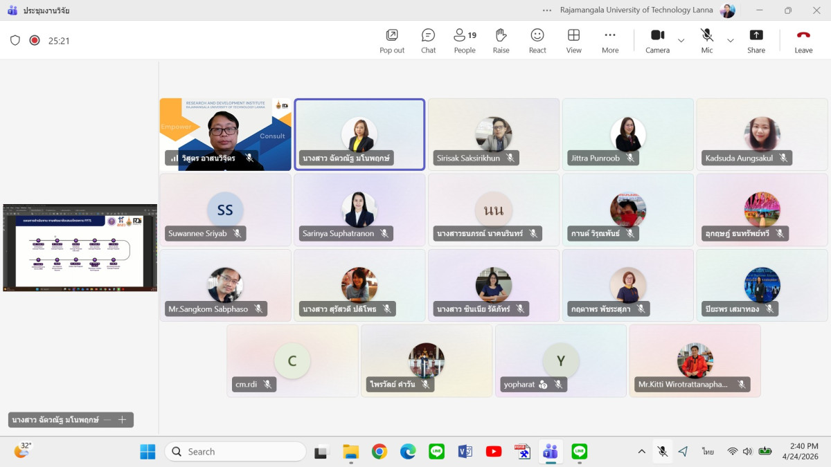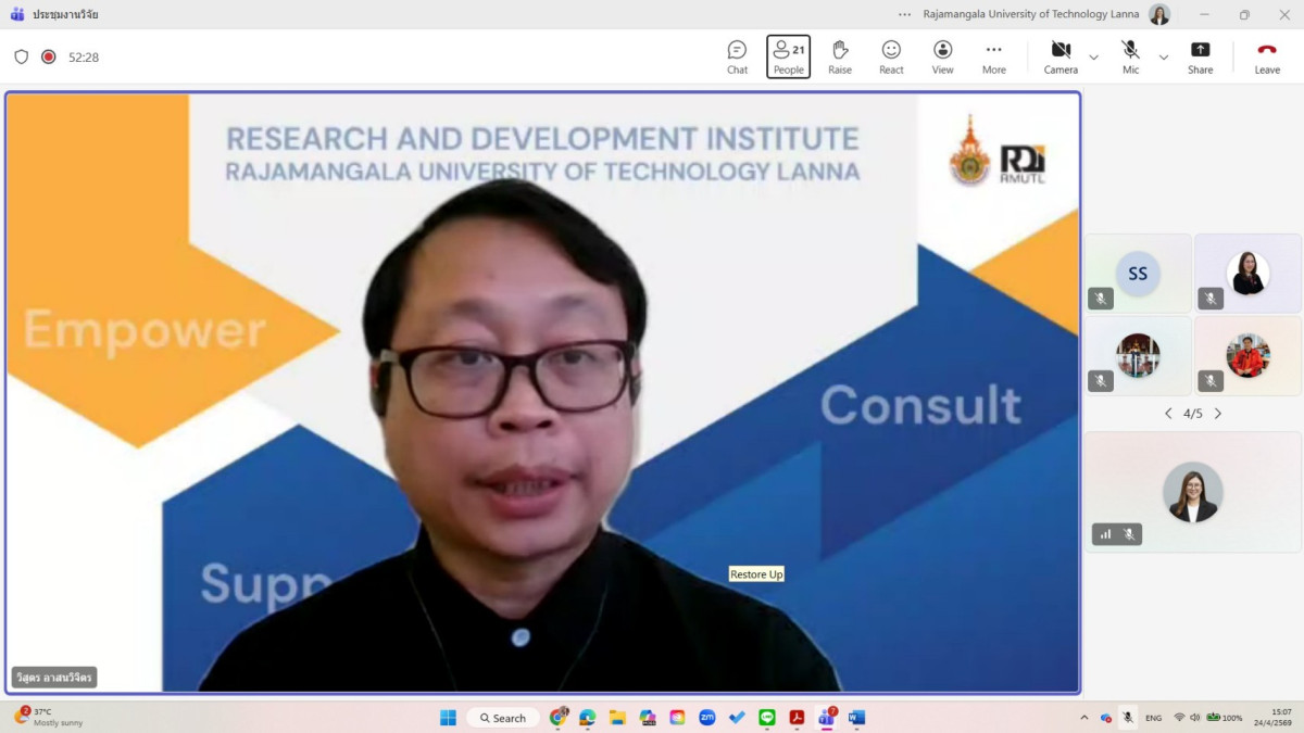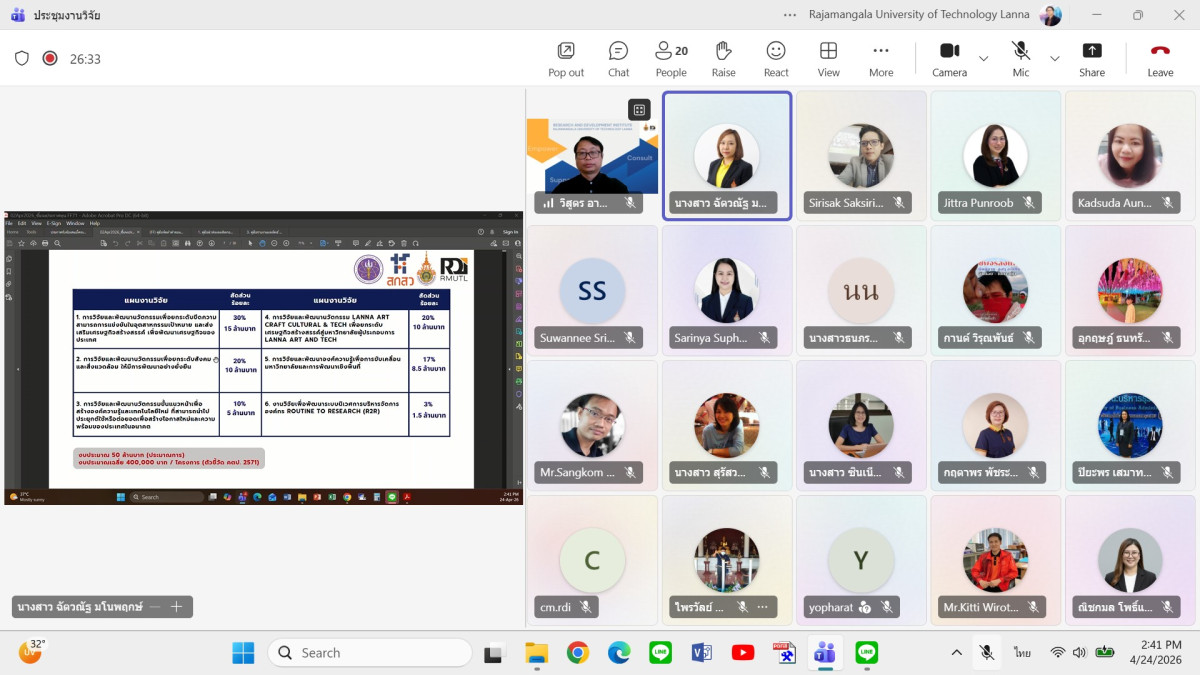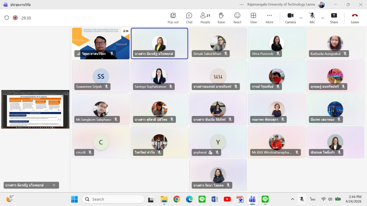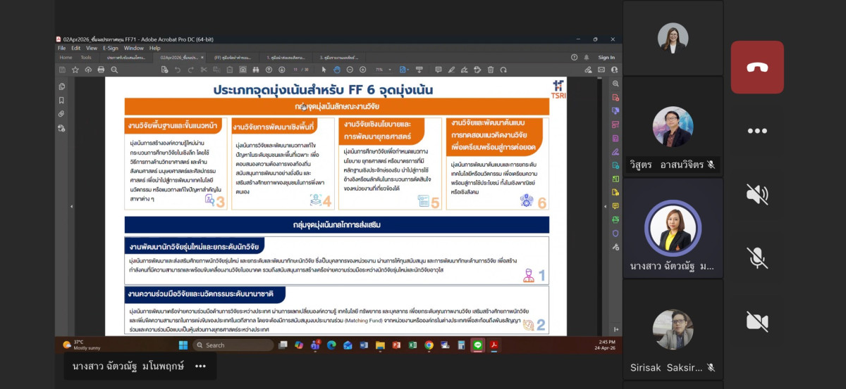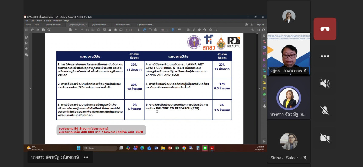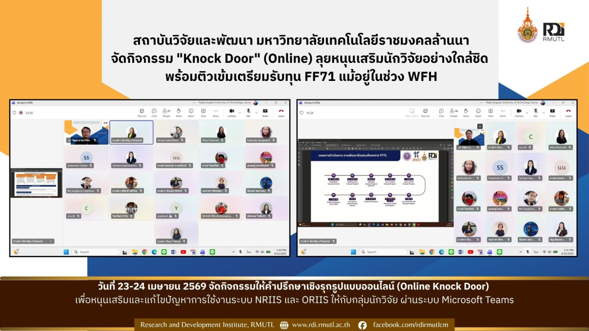 วันที่ 23 - 24 เมษายน 2569 สถาบันวิจัยและพัฒนา โดยกลุ่มงานบริหารทุนและสนับสนุนทุนวิจัย เดินหน้าขับเคลื่อนงานวิจัยอย่างต่อเนื่อง จัดกิจกรรมให้คำปรึกษาเชิงรุกรูปแบบออนไลน์ (Online Knock Door) เพื่อหนุนเสริมและแก้ไขปัญหาการใช้งานระบบ NRIIS และ ORIIS ให้กับกลุ่มนักวิจัย ผ่านระบบ Microsoft Teams