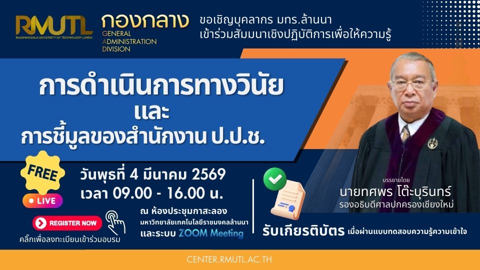 มหาวิทยาลัยเทคโนโลยีราชมงคลล้านนา มุ่งมั่นขับเคลื่อนองค์กรสู่ความเป็นเลิศด้านการบริหารจัดการด้วยหลักธรรมาภิบาลและความโปร่งใส ขอเชิญผู้บริหาร คณาจารย์ และบุคลากรทุกท่าน เข้าร่วม "โครงการสัมมนาเชิงปฏิบัติการเพื่อให้ความรู้เกี่ยวกับการดำเนินการทางวินัยและการชี้มูลของสำนักงาน ป.ป.ช."