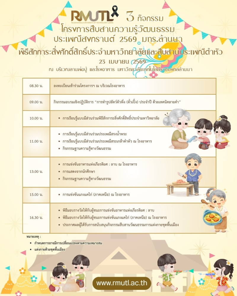 ขอเชิญร่วมงาน “พิธีสักการะสิ่งศักดิ์สิทธิ์ประจำมหาวิทยาลัยและสืบสานประเพณีดำหัว โครงการสืบสานความรู้วัฒนธรรมประเพณีสงกรานต์ ” ![]()