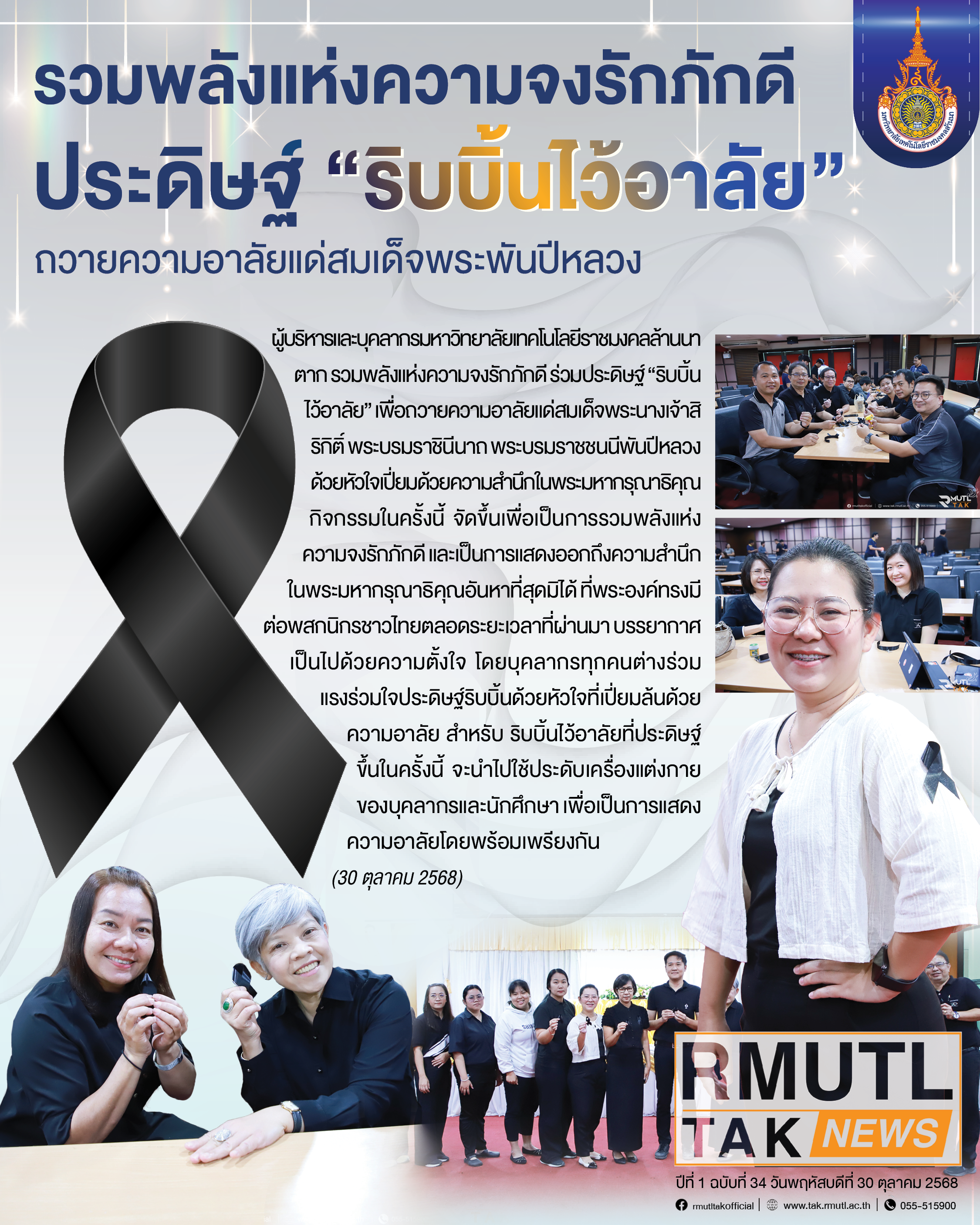 วันนี้ (30 ต.ค. 68) เวลา 09.00 น. ที่ห้องประชุมทองกวาว ผู้บริหารและบุคลากรมหาวิทยาลัยเทคโนโลยีราชมงคลล้านนา ตาก รวมพลังแห่งความจงรักภักดี ร่วมประดิษฐ์ “ริบบิ้นไว้อาลัย” เพื่อถวายความอาลัยแด่สมเด็จพระนางเจ้าสิริกิติ์ พระบรมราชินีนาถ พระบรมราชชนนีพันปีหลวง ด้วยหัวใจเปี่ยมด้วยความสำนึกในพระมหากรุณาธิคุณ