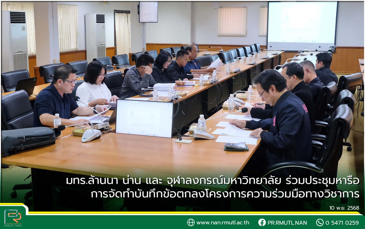 วันจันทร์ที่ 10 พฤศจิกายน 2568 เวลา 13.30 น. มหาวิทยาลัยเทคโนโลยีราชมงคลล้านนา น่าน โดย ผู้ช่วยศาสตราจารย์ ดร.วิโรจน์ มงคลเทพ (ผู้อำนวยการสำนักงานบริหารมหาวิทยาลัย) พร้อมผู้บริหารและตัวแทน ได้ประชุมร่วมกับ ศูนย์การเรียนรู้และบริการวิชาการ เครือข่ายแห่งจุฬาลงกรณ์มหาวิทยาลัย โดย ผู้ช่วยศาสตราจารย์ ดร.นพดล กิตนะ (ผู้อำนวยการศูนย์เครือข่ายการเรียนรู้เพื่อภูมิภาค) และคณะ ณ ห้องประชุมชมภูพูคา อาคารอำนวยการ