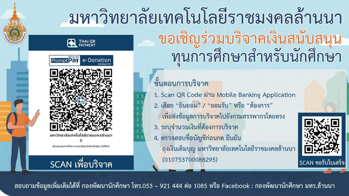 ที่มา : มหาวิทยาลัยเทคโนโลยีราชมงคลล้านนา ขอเชิญร่วมบริจาคเงินสนับสนุนน ทุนการศึกษาสำหรับนักศึกษา