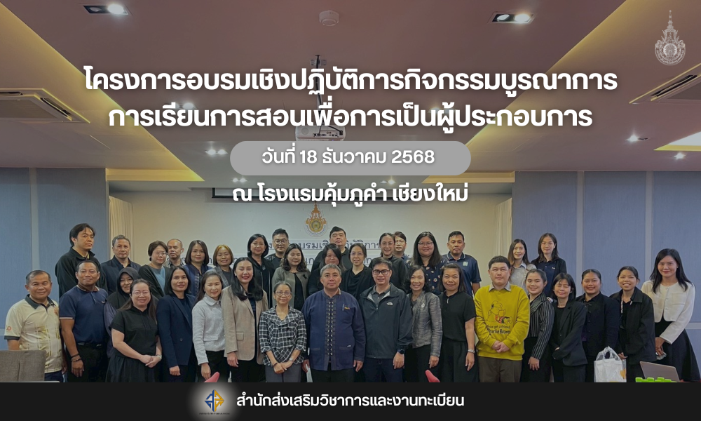 ในวันพฤหัสบดีที่ 18 ธันวาคม 2568 สำนักส่งเสริมวิชาการและงานทะเบียน ได้ดำเนินโครงการอบรมเชิงปฏิบัติการกิจกรรมบูรณาการ การเรียนการสอนเพื่อการเป็นผู้ประกอบการ ณ โรงแรมคุ้มภูคำ จังหวัดเชียงใหม่ เพื่อเสริมสร้างความรู้ ความเข้าใจ และแนวทางการจัดการเรียนการสอนที่มุ่งพัฒนาสมรรถนะผู้ประกอบการให้แก่บุคลากรทางการศึกษา