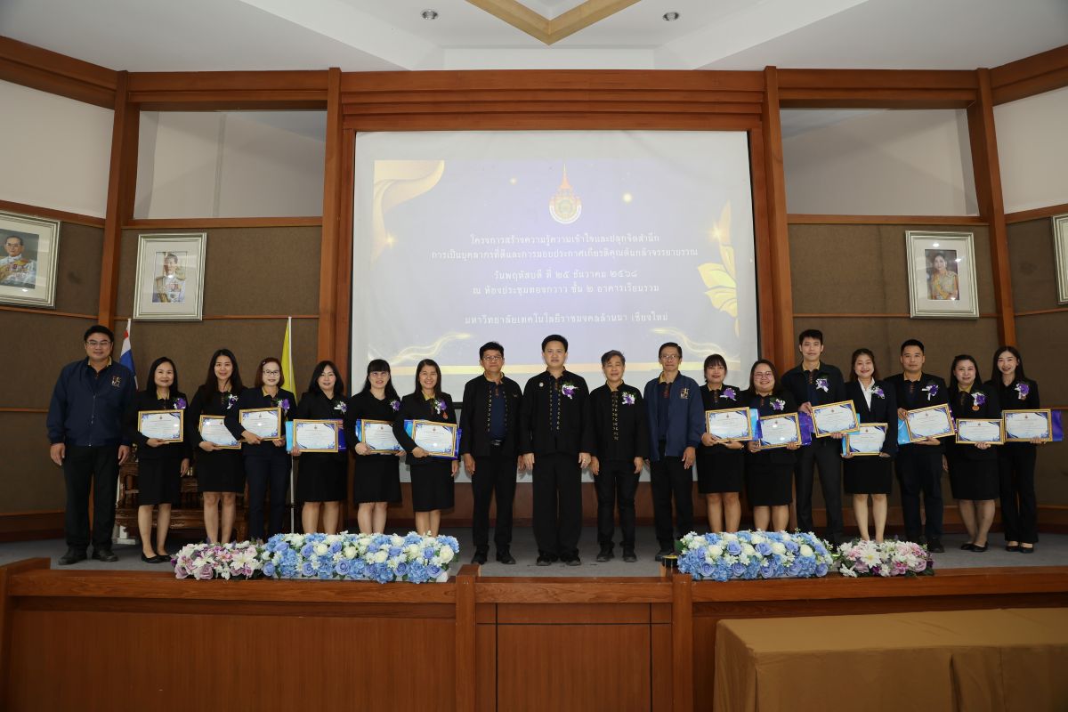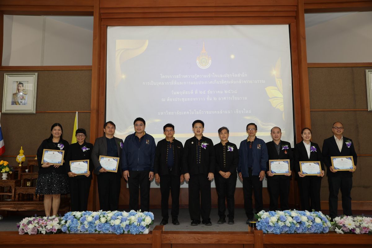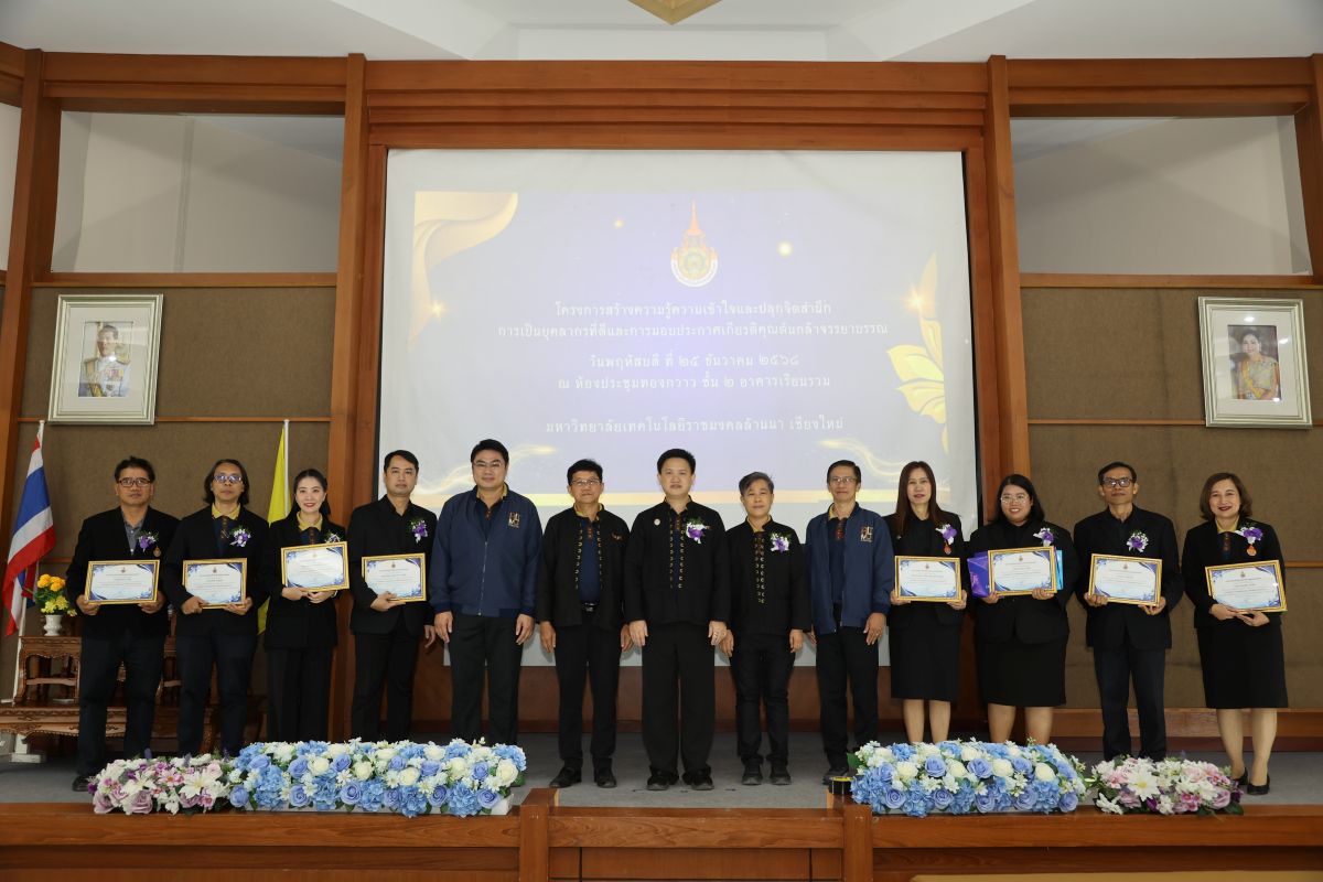 วันที่ 25 ธันวาคม 2568 มหาวิทยาลัยเทคโนโลยีราชมงคลล้านนา เดินหน้าขับเคลื่อนแผนปฏิบัติการส่งเสริมคุณธรรม จริยธรรม ภายใต้โครงการสร้างความรู้ความเข้าใจและปลูกจิตสำนึกการเป็นบุคลากรที่ดีจัดพิธีมอบรางวัล “ผู้มีจรรยาบรรณดีเด่น” ภายใต้โครงการต้นกล้าจรรยาบรรณ ประจำปี พ.ศ. 2568 โดยมี ผู้ช่วยศาสตราจารย์ ดร.อรรณพ ทัศนอุดม รักษาราชการแทนอธิการบดี เป็นประธานมอบรางวัลแก่คณาจารย์และบุคลากรผู้ผ่านการคัดเลือกจำนวน 61 ราย ณ ห้องประชุมทองกวาว มทร.ล้านนา พร้อมทั้งร่วมรับฟัง การบรรยายเรื่อง “การสร้างความรู้ความเข้าใจและปลุกจิตสำนึกการเป็นบุคลากรที่ดี” โดยวิทยากรจาก สำนักงาน ป.ป.ช. ภาค 5 ณ ห้องประชุมทองกวาว อาคารเรียนรวม มทร.ล้านนา