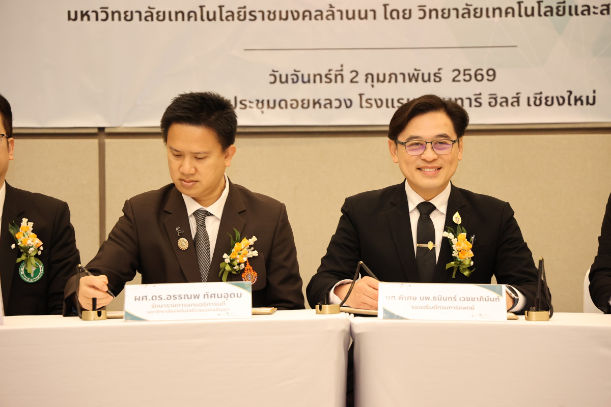 วันที่ 2 กุมภาพันธ์ 2569 ผู้ช่วยศาสตราจารย์ ดร.อรรณพ ทัศนอุดม รักษาราชการแทนอธิการ มทร.ล้านนา เป็นประธานการลงนามความร่วมมือทางวิชาการ และร่วมหารือการดำเนินงานหลักสูตรประกาศนียบัตรผู้ช่วยพยาบาล เพื่อส่งเสริมและพัฒนาความร่วมมือด้านวิชาการ โดยมีเป้าหมายในการบูรณาการองค์ความรู้และทรัพยากรของแต่ละหน่วยงาน เพื่อพัฒนาหลักสูตร การจัดการศึกษา การวิจัย การพัฒนากำลังคนด้านการพยาบาลและการสาธารณสุข และการบริการทางวิชาการ นำไปสู่การยกระดับคุณภาพด้านการแพทย์และการสาธารณสุขอย่างเป็นระบบและยั่งยืน ร่วมกับกรมการแพทย์ โดยโรงพยาบาลประสาทเชียงใหม่ และมหาวิทยาลัยราชภัฏลำปาง โดยคณะพยาบาลศาสตร์ ณ ห้องดอยหลวง โรงแรมแคนทารีฮิลส์ เชียงใหม่