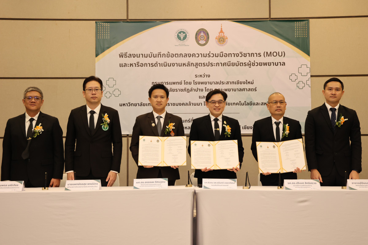 มทร.ล้านนาโดยวิทยาลัยเทคโนโลยีและสหวิทยาการ ลงนามความร่วมมือทางวิชาการ (MOU) ระหว่างกรมการแพทย์ โดยโรงพยาบาลประสาทเชียงใหม่ และมหาวิทยาลัยราชภัฏลำปาง โดยคณะพยาบาลศาสตร์ สร้างความร่วมมือทางวิชาการ มุ่งเป้าเปิดหลักสูตรประกาศนียบัตรผู้ช่วยพยาบาล (1 ปี) ชูจุดเด่นการบูรณาการเทคโนโลยีสมัยใหม่เข้ากับทักษะการดูแลเฉพาะทาง หวังผลิตบุคลากรคุณภาพป้อนตลาด Health Tech และรองรับ Medical Hub ในอนาคต