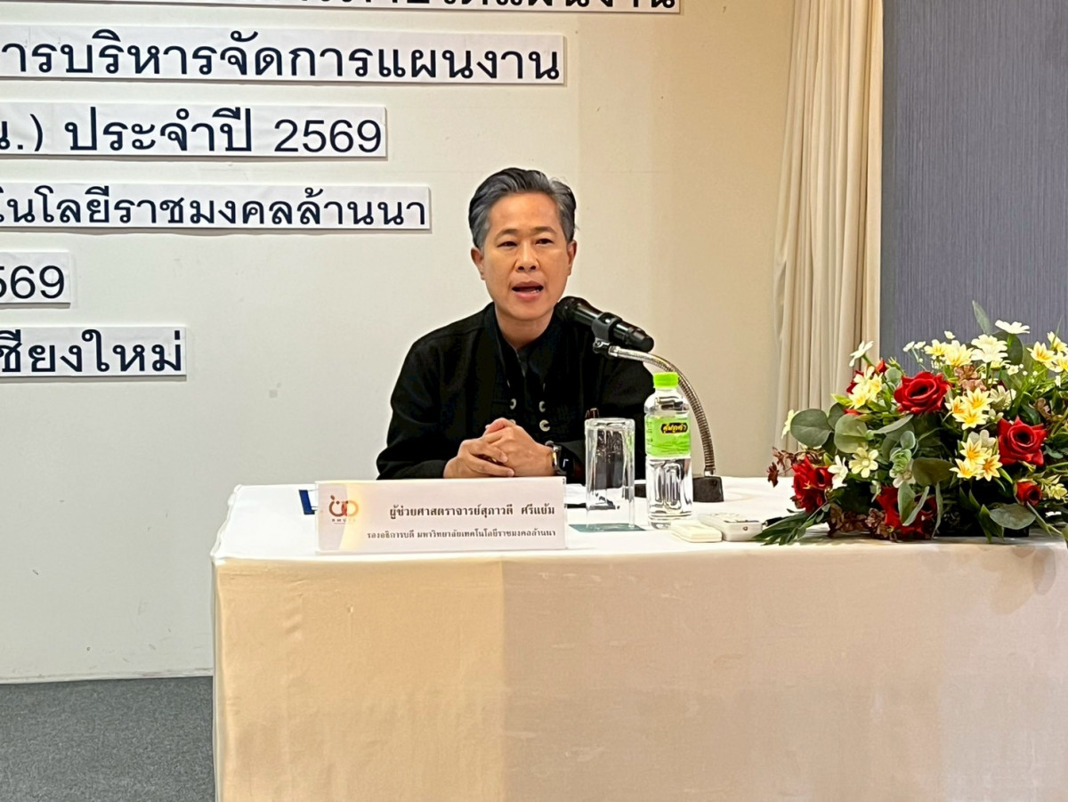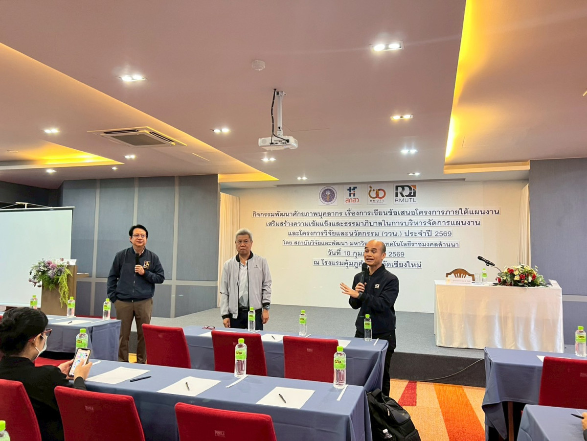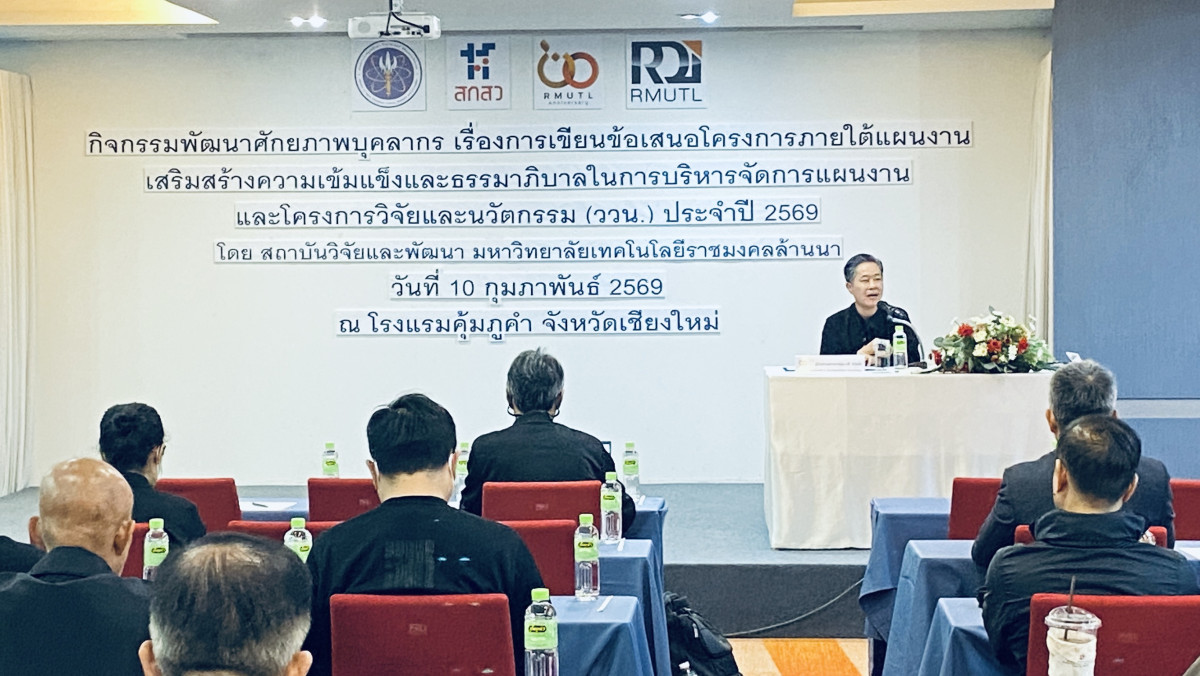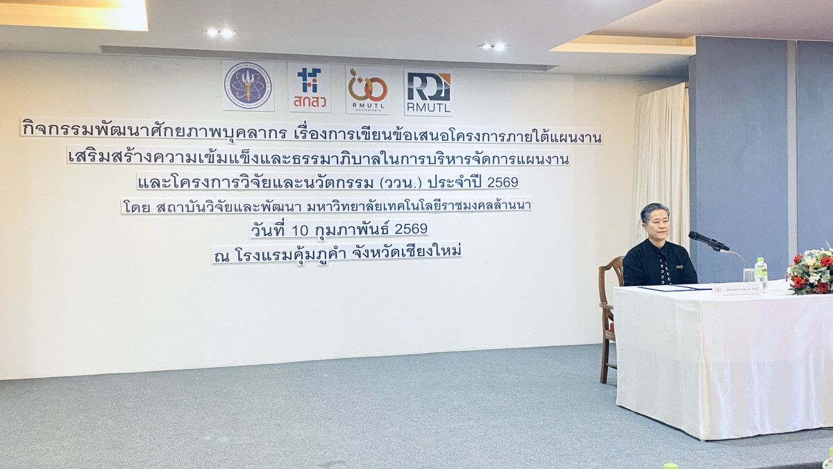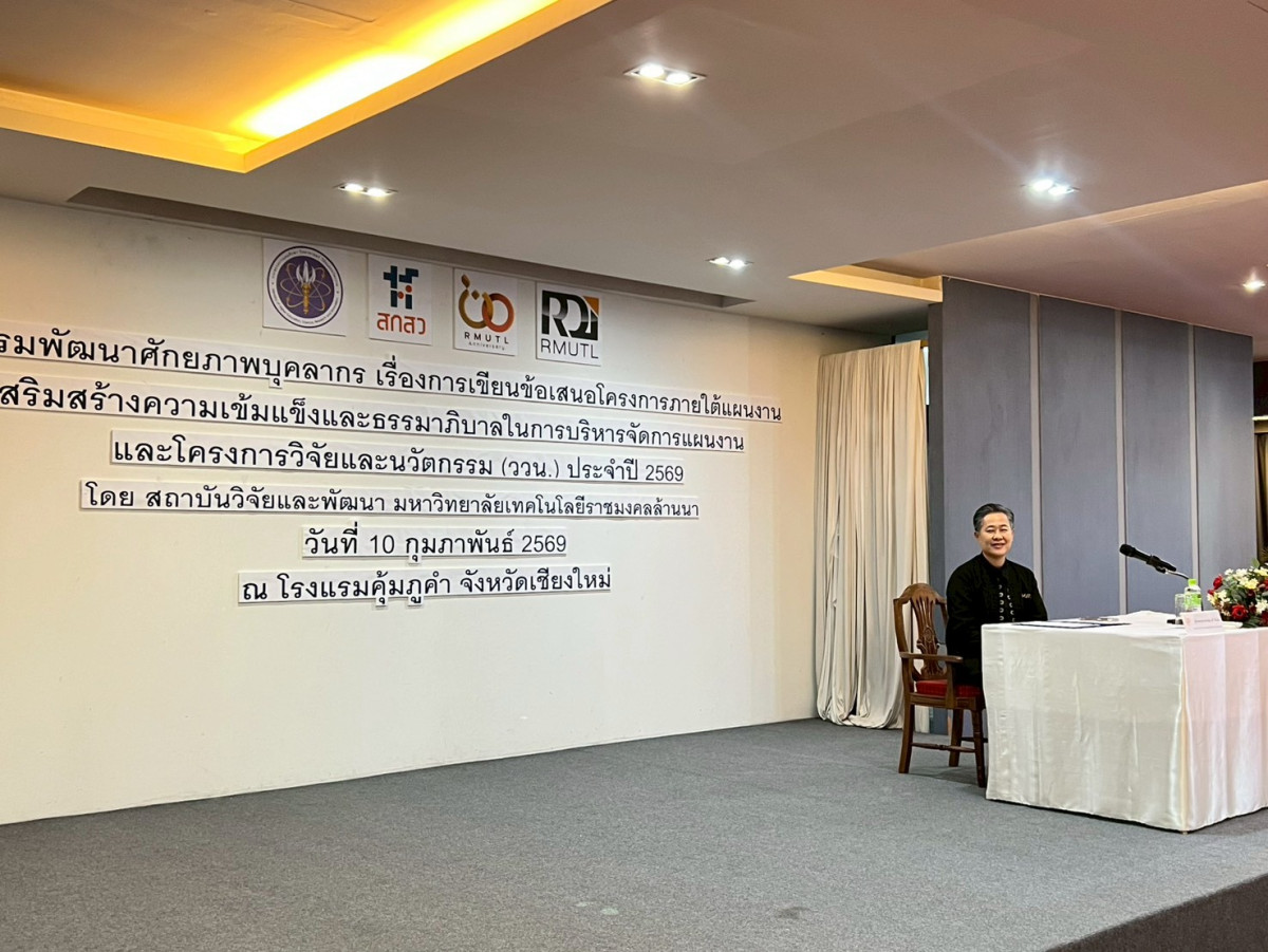 วันที่ 10 กุมภาพันธ์ 2569 สถาบันวิจัยและพัฒนา มหาวิทยาลัยเทคโนโลยีราชมงคลล้านนา จัดกิจกรรมพัฒนาศักยภาพบุคลากร เรื่อง การเขียนข้อเสนอโครงการ ภายใต้แผนงานเสริมสร้างความเข้มแข็งและธรรมาภิบาลในการบริหารจัดการแผนงานและโครงการวิจัยและนวัตกรรม (ววน.) ประจำปีงบประมาณ 2569 ณ ห้องสุพรรณิการ์ โรงแรมคุ้มภูคำ