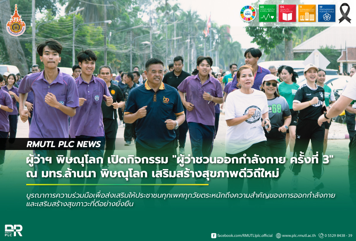 เมื่อวันที่ 23 กุมภาพันธ์ 2569 เวลา 17.00 น. ณ มหาวิทยาลัยเทคโนโลยีราชมงคลล้านนา พิษณุโลก นายเกียรติศักดิ์ ตรงศิริ ผู้ว่าราชการจังหวัดพิษณุโลก เป็นประธานในพิธีเปิดกิจกรรม "ผู้ว่าชวนออกกำลังกาย ครั้งที่ 3" โดยมี นายบุญฤทธิ์ สโมสร ผู้อำนวยการสำนักงานบริหาร พร้อมด้วยคณะผู้บริหารมหาวิทยาลัยฯ เจ้าหน้าที่จากสำนักงานท่องเที่ยวและกีฬาจังหวัดพิษณุโลก องค์การบริหารส่วนตำบลบ้านกร่าง ข้าราชการ พนักงานรัฐวิสาหกิจ ภาคเอกชน ตลอดจนนักเรียน นักศึกษา และประชาชนในพื้นที่เข้าร่วมกิจกรรมอย่างพร้อมเพรียง