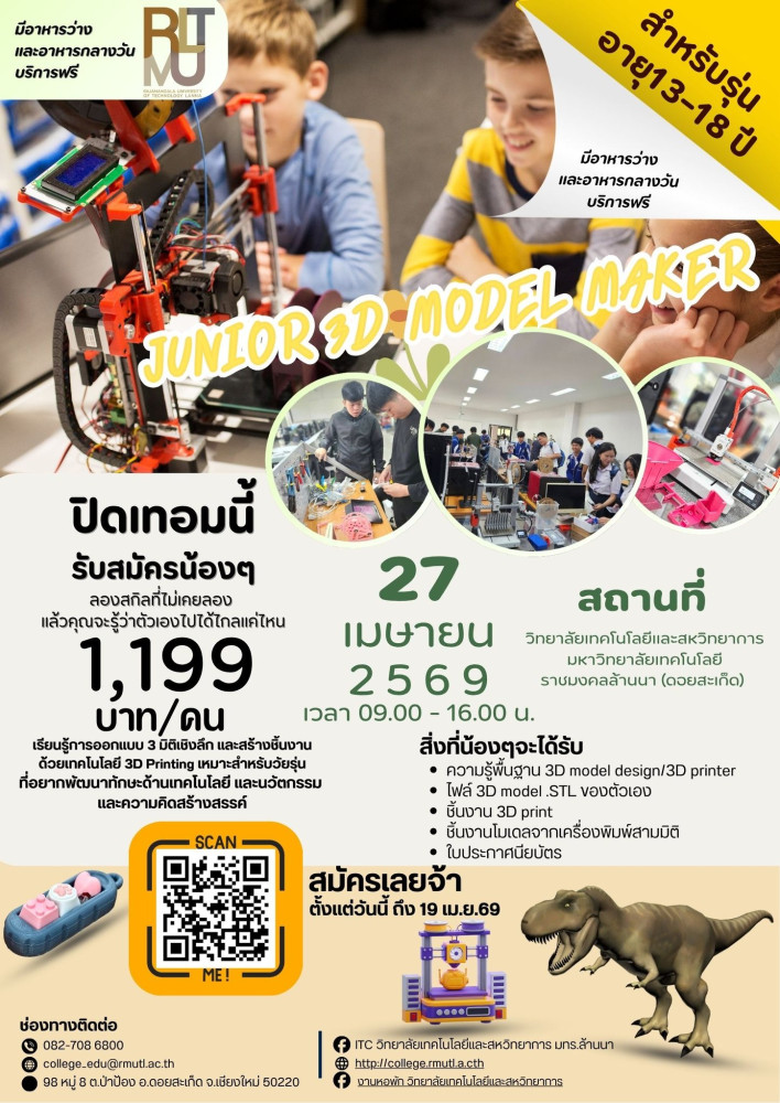 มหาวิทยาลัยเทคโนโลยีราชมงคลล้านนา โดยวิทยาลัยเทคโนโลยีและสหวิทยาการ (ITC) ขอเชิญชวนผู้ปกครองส่งบุตรหลานเข้าร่วมกิจกรรมเสริมสร้างทักษะด้านเทคโนโลยีและนวัตกรรม ในโครงการ “Junior & Mini 3D Model Maker” ซึ่งจัดขึ้นในช่วงปิดภาคเรียน เพื่อเปิดโอกาสให้เยาวชนได้เรียนรู้กระบวนการออกแบบสามมิติ (3D Model Design) และการสร้างชิ้นงานจริงด้วยเทคโนโลยีเครื่องพิมพ์สามมิติ (3D Printing) อันเป็นทักษะสำคัญในศตวรรษที่ 21